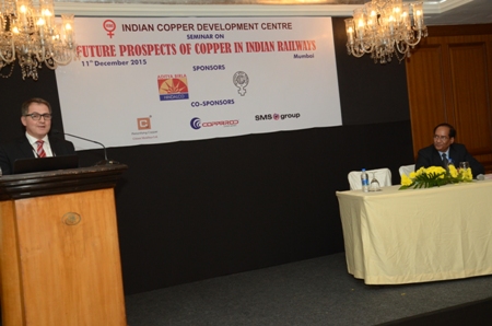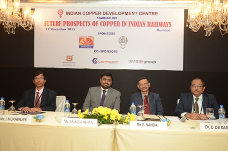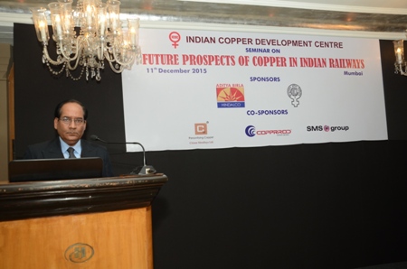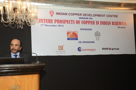 Indian Copper Development Centre (ICDC) organized the seminar on “Future Prospects of Copper in Indian Railways” in Mumbai on 11th December, 2015. About 70 participants from various parts of the country and abroad attended the programme. They represented different units of Indian Railways, primary copper producers, downstream copper product manufacturers, equipment manufacturers, consultants, etc.