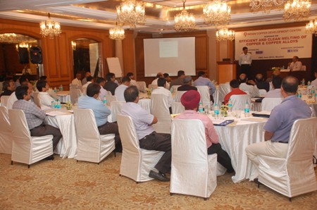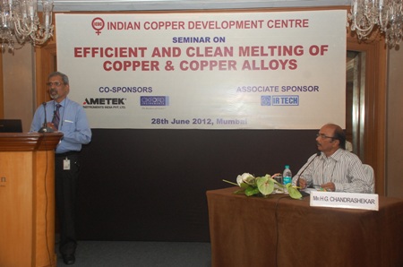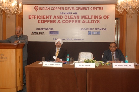 ICDC organized a seminar on “Efficient and Clean Melting of Copper & Copper Alloys” in Mumbai on 28th June’12. The seminar was attended by about 70 participants from various parts of the country. They represented the copper & copper alloy semis manufacturers and manufacturers of furnaces, crucible, refractories, fluxes – degassers – deoxidisers, measuring and control equipments, viz., pyrometer, thermocouple, spectroscope, oxygen/hydrogen analyzers, etc.